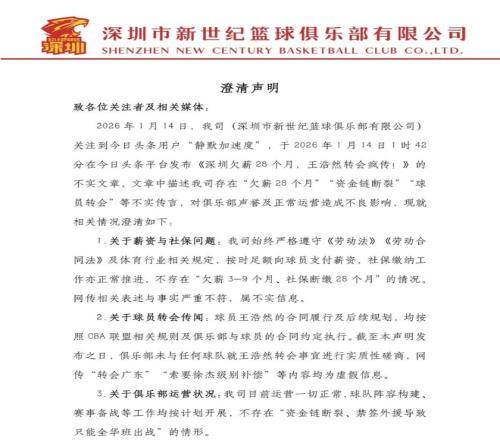 1月14日,深圳男籃更新官方賬號(hào),回?fù)袅瞬涣甲悦襟w關(guān)于俱樂(lè)部“欠薪”和“球員轉(zhuǎn)會(huì)”等謠言。